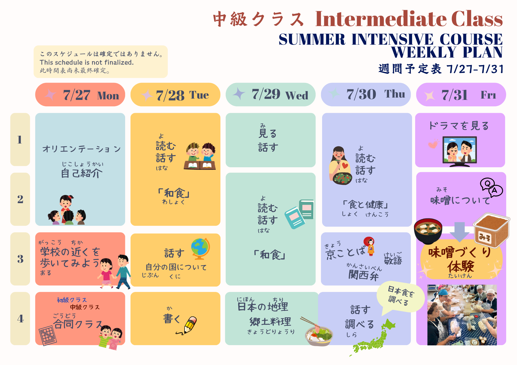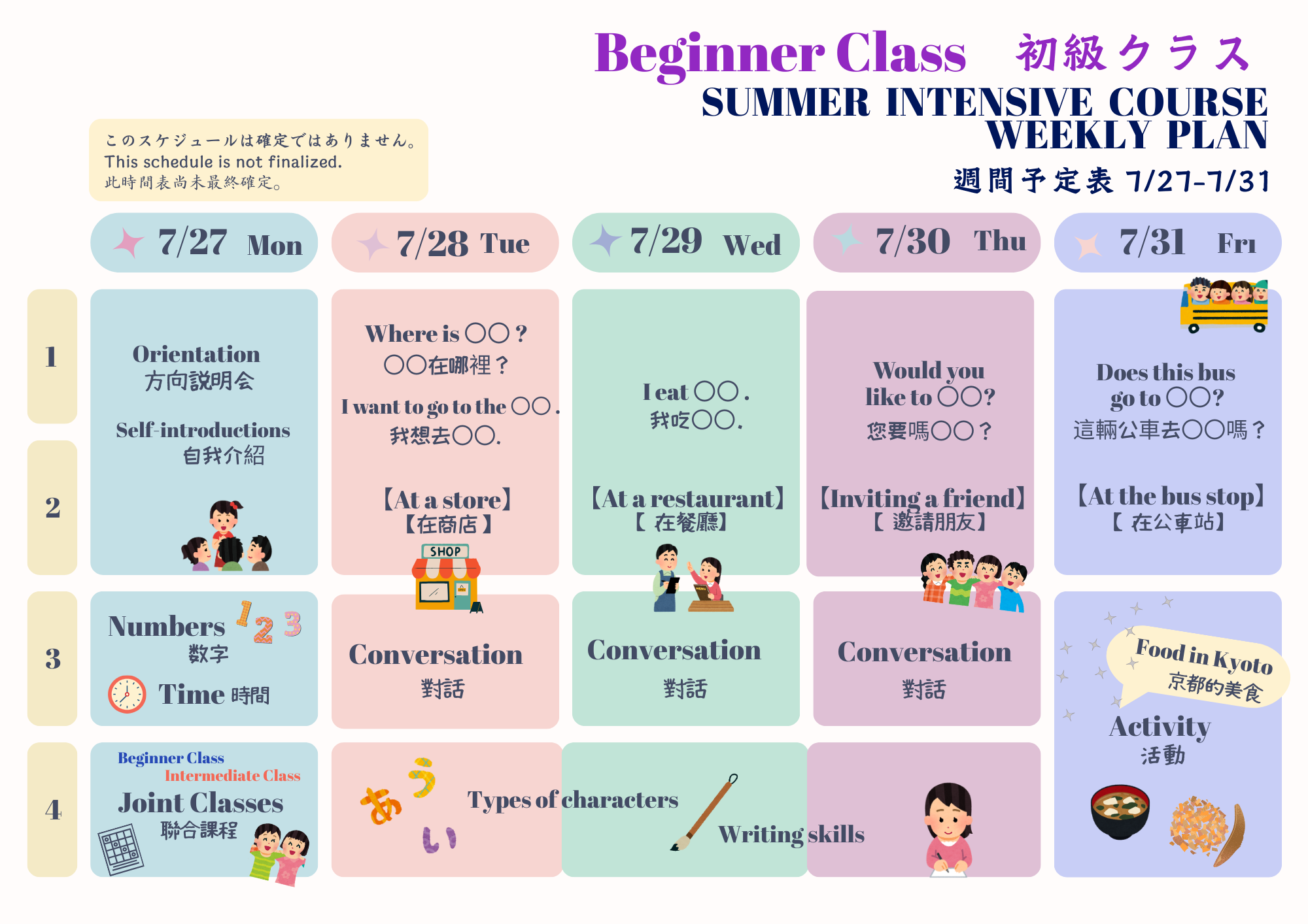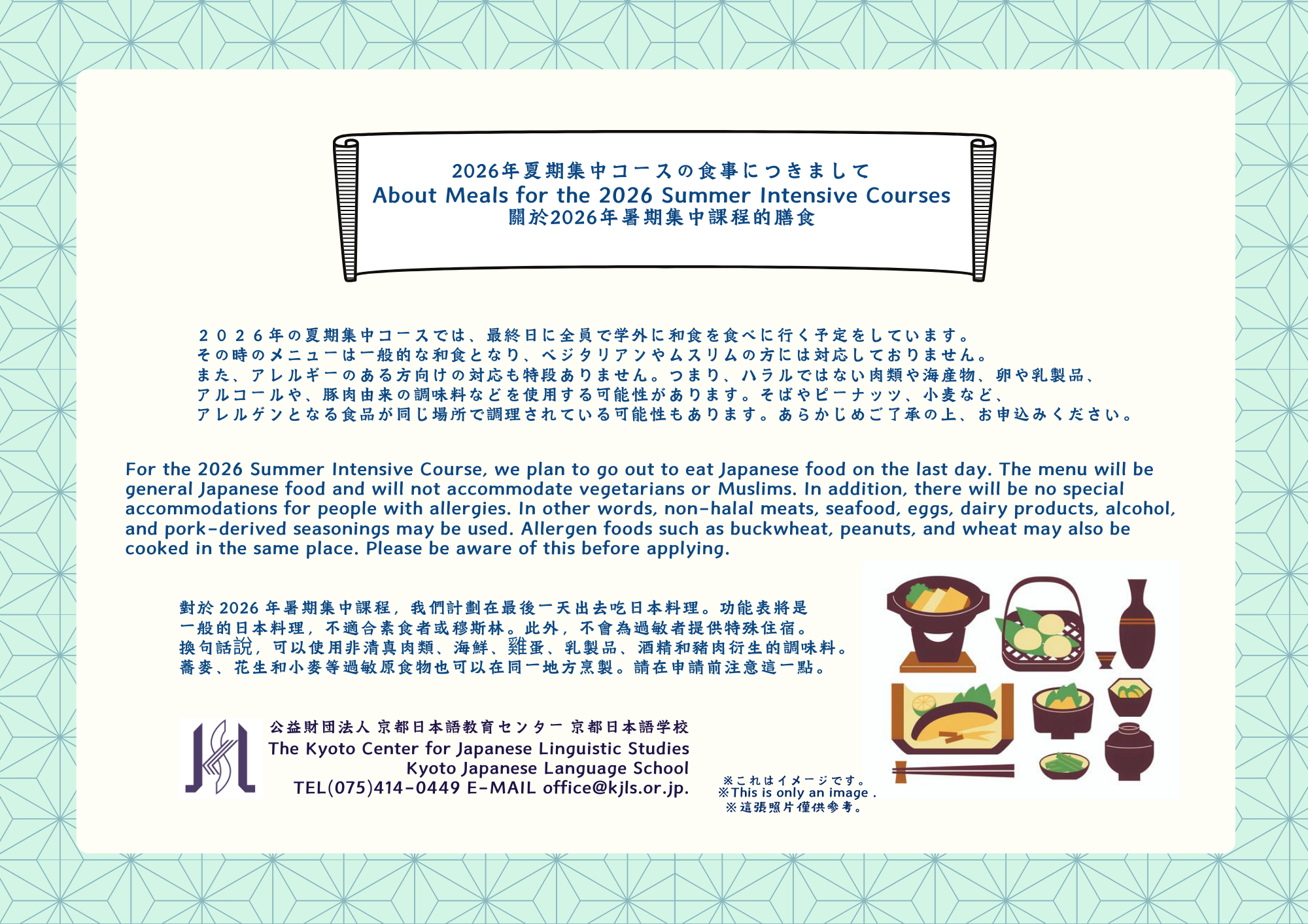 2026년 여름 코스에서는 마지막 날에 전원이 학교 밖으로 일식을 먹으러 갈 예정입니다. 그 때의 메뉴는 일반적인 일식이며, 채식주의자나 무슬림은 대응하지 않습니다. 또한 알레르기가 있는 분들을 위한 대응도 특별히 없습니다. 즉, 할랄이 아닌 육류나 해산물, 계란이나 유제품, 알코올이나 돼지고기 유래의 조미료 등을 사용할 가능성이 있습니다. 소바나 땅콩, 밀 등 알레르겐이 되는 식품이 같은 장소에서 조리되고 있을 가능성도 있습니다. 미리 양해하신 후에, 신청해 주세요.